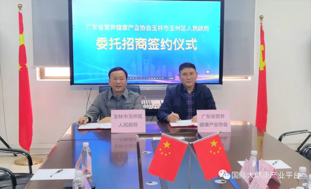 12月19日,广西玉林市玉州区人民政府与广东省营养健康产业协会正式签订委托招商引资协议。双方出席签约领导分别有:广东省现代健康产业研究院院长、广东省营养健康产业协会理事长张咏,广东省营养健康产业协会理事长张咏,广东省营养健康产业协会副秘书长李宥萱,玉州区委副书记、区长莫景彪,玉州区政协主席杨树信,玉州区人民法院党组书记、院长莫伟 ,玉州区政府办主任黄旭雄,玉州区市场监管局局长陈超,玉州区投资促进服务中心主任郭俊卿,玉州区城投公司董事长张波,玉州区东融园区投资公司负责人陈香松,玉州区政府办干部钟仕川 ,广药集团 王老吉大健康投资股份有限公司总监马摇南。